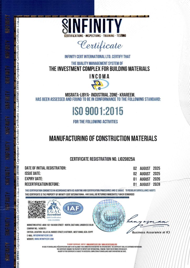 تأسست شركة المجمع الاستثماري لصناعة مواد البناء المساهمة والمعروفة تجارياً باسم “إنكوما” وفق أحكام القانون رقم 5 لسنة 1997 م. بشأن تشجيع استثمار رؤوس الأموال الأجنبية ولائحته التنفيذية وأحكام القانون التجاري الليبي، سجل تجاري رقم 45890، وسجل استثماري رقم 40 وباشرت نشاطها في مدينة مصراتة الليبية بتنفيذ مصنع البلاط الخزفي (السيراميك) الحائطي والأرضي بموجب الترخيص رقم 032 المؤرخ في 30/9/2007 م.